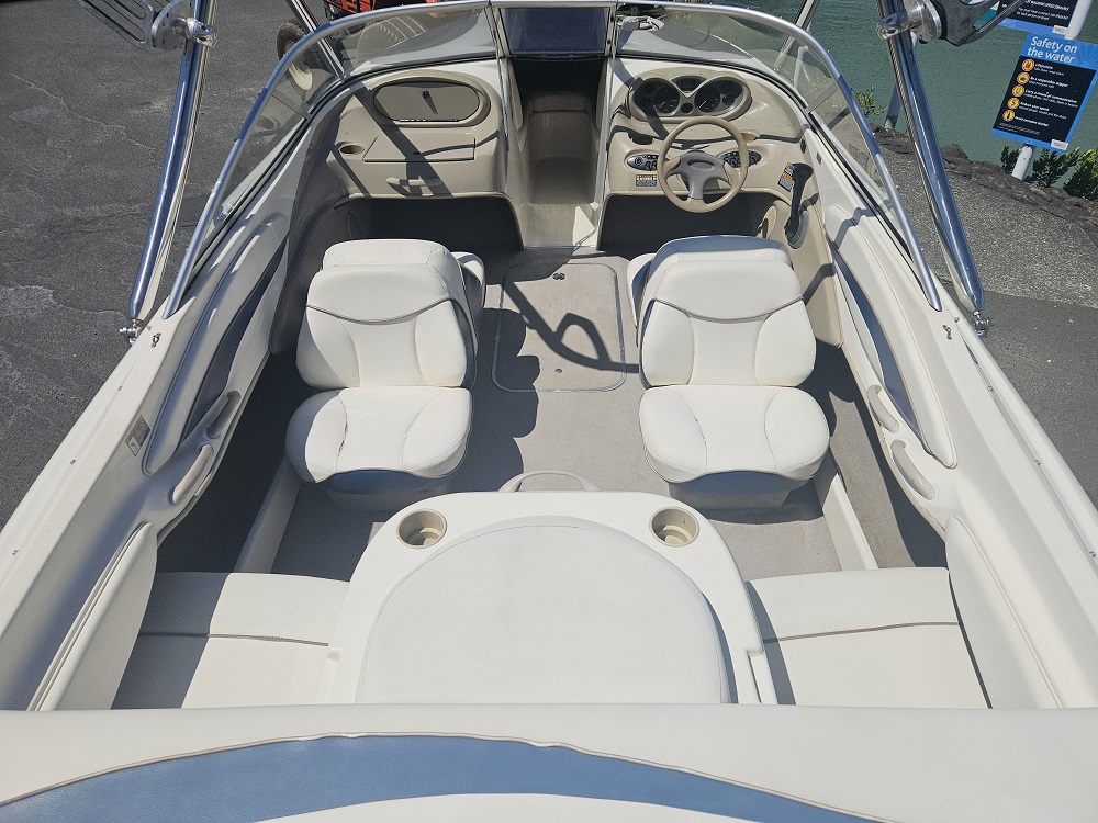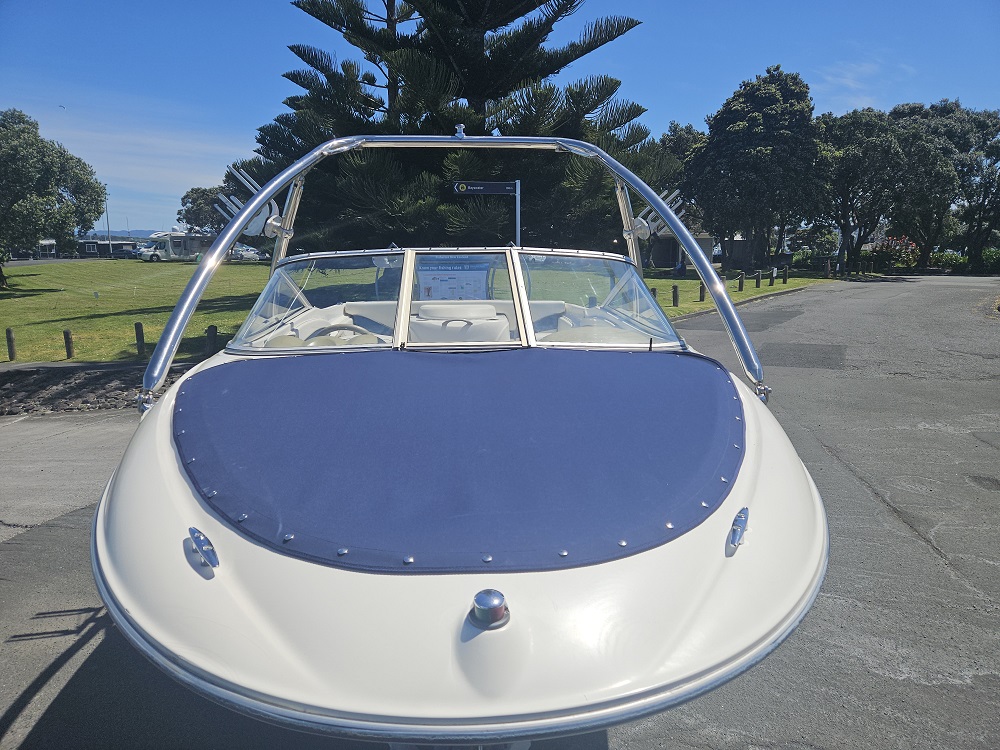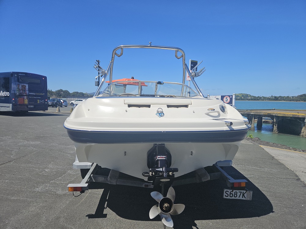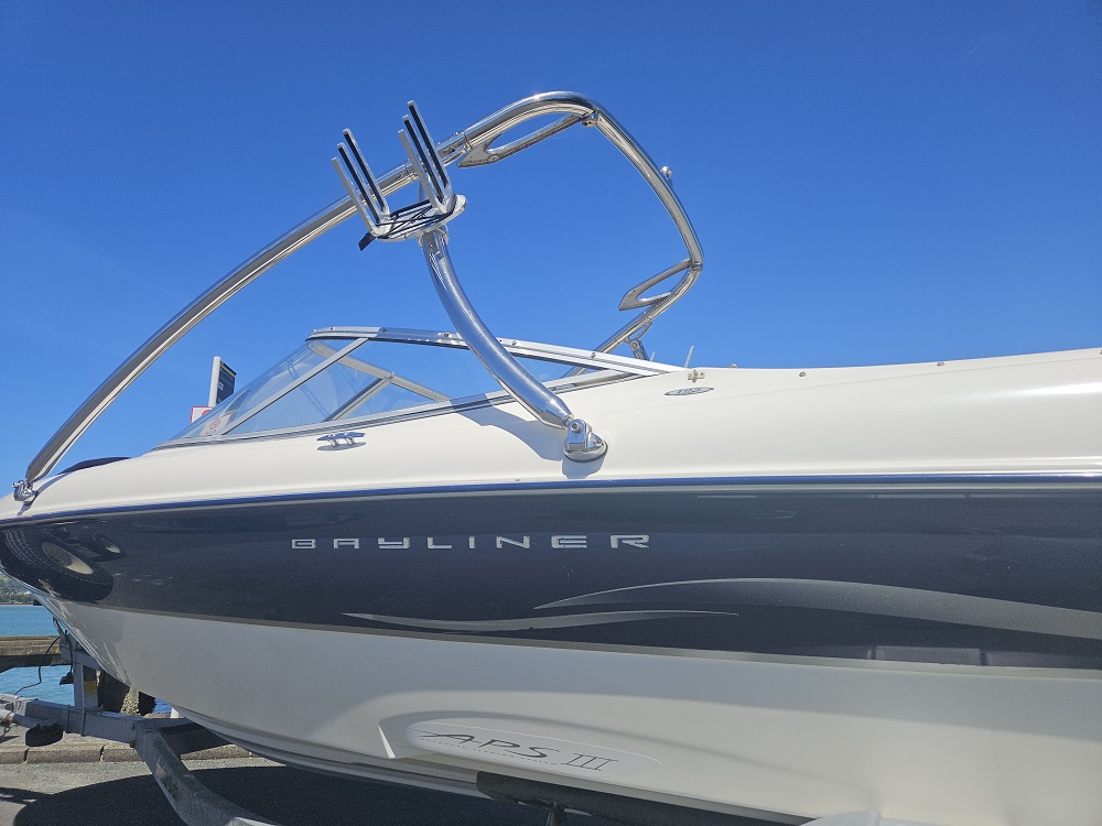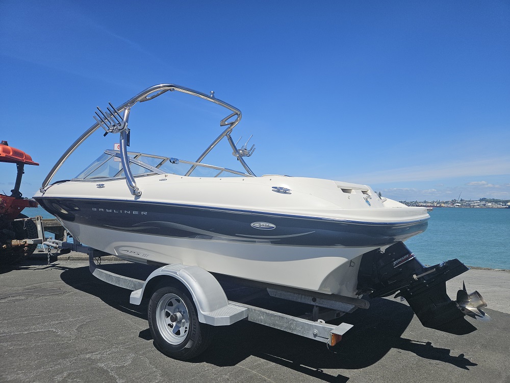 ****** SOLD ****** SOLD ******** Wakeboard ready 2002 Bayliner 195 sports bowrider, 220 hp 5ltr 4-stroke V8 Mercruiser, only 242 hrs, fully serviced, stainless 5 blade prop, X-Air stainless wakeboard tower with twin board racks, 8 seater, back to back fold down sleeper seats, rear seats remove for fishing and also lift to form rear sunlounger pad, full instrumentation, tilt steering, glove box, walk through windscreen to bow seats, underseat storage, underfloor storage locker, cup holders, bow cover, road cover, storage cover, integrated rear swim platform with stainless boarding ladder and ski tow ring. Comes on galvanised single axle trailer with regn and wof. Effortless smooth power with comfortable seating and smooth handling, ready to go for summer.