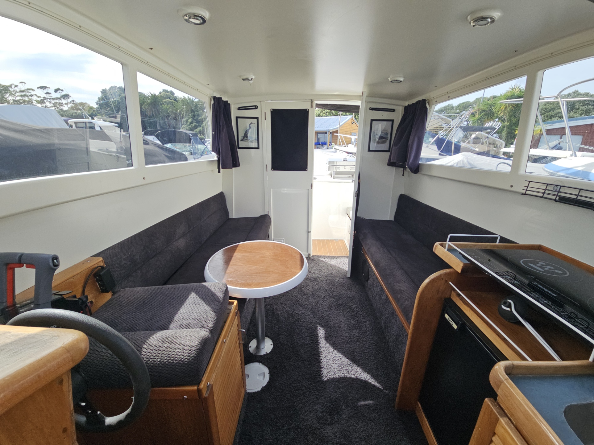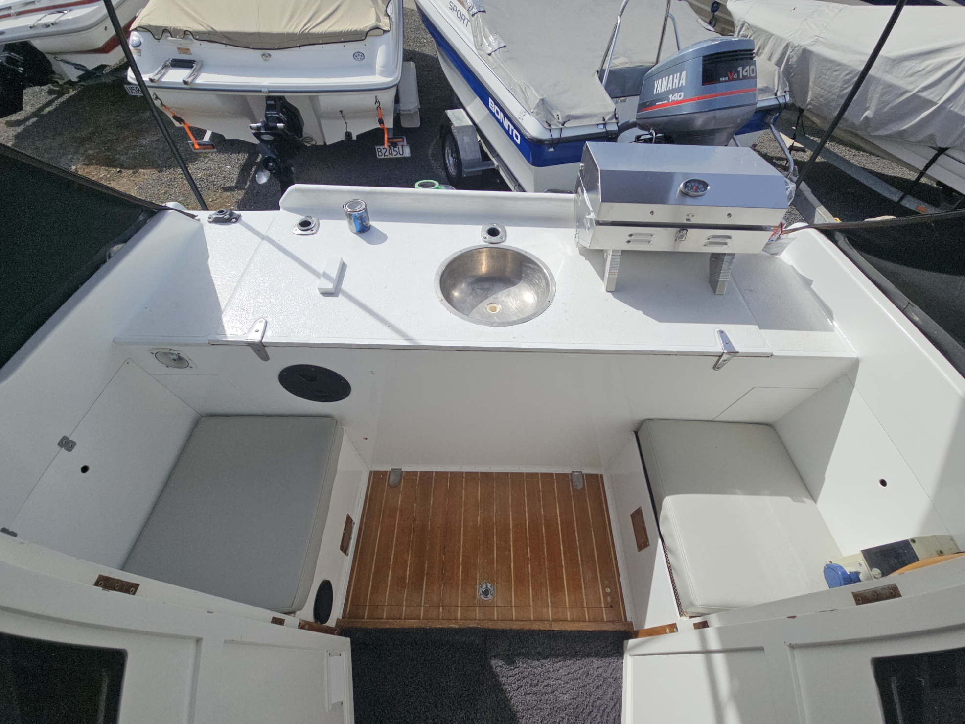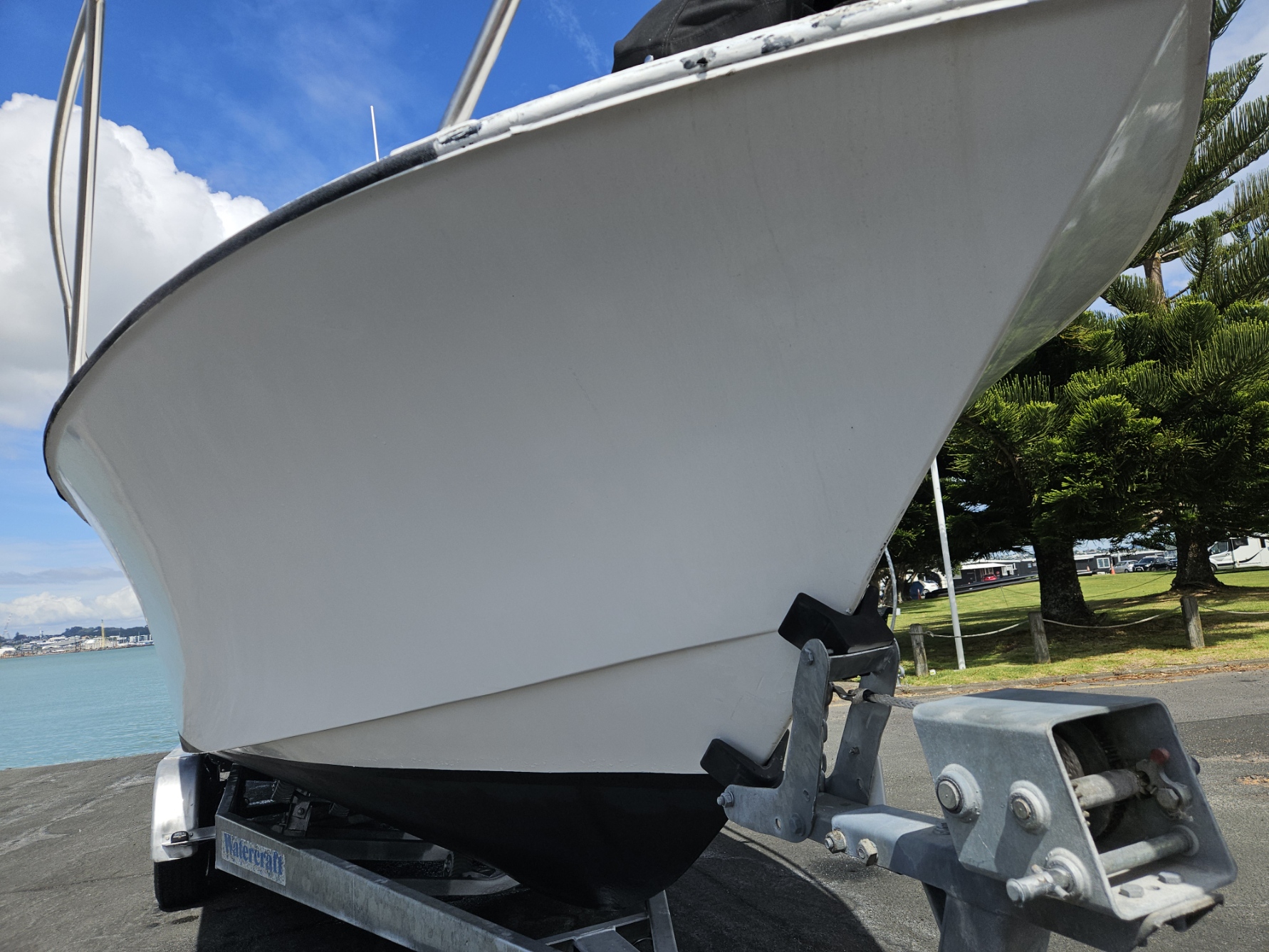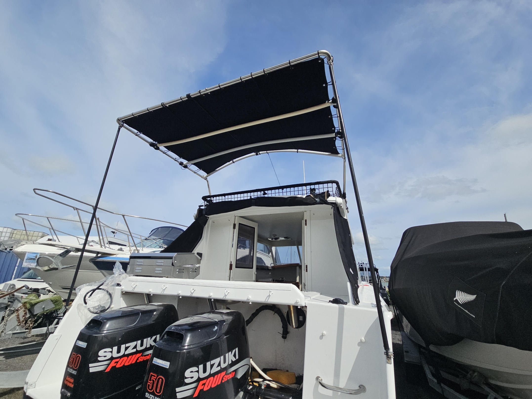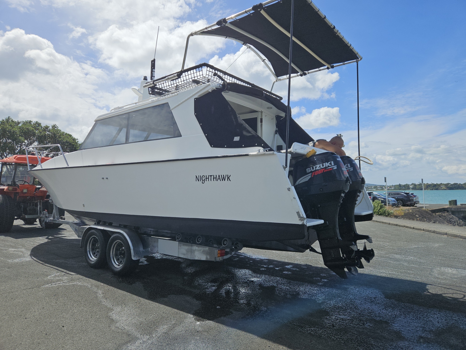 Very tidy 1996 Pelin Topaz 8.5 mtr weekender, twin 2008 Suzuki DF50 4-stroke outboards, just been fully serviced, 675 hrs, cruises 15 knts max 20 knts, 27 ltrs per hour using both motors, 200 ltr fuel tank, 100 ltr water tank, current e-wof, Maxwell electric drum winch, sleeps 4 in forward double berth and 2 singles, galley with sink, double electric induction cooktop, fridge, brand new gas bbq, 2000 watt inverter, whale hot water cylinder which runs off either shore power or engines while running, transom shower, separate toilet with macerator pump, all led lighting, new Rhino carpet throughout, new squabs upholstery, electric bilge pumps, new diesel heater, full instrumentation, Ray marine gps / fish finder, vhf, 3 x batteries with solar charging panels, custom bimini top sun shade, roof top storage cage, forward hatch, stainless bow rails. Very tidy boat that has been well looked after and maintained by current owner. Optional tandem launching trailer available for $2500 sold separately.